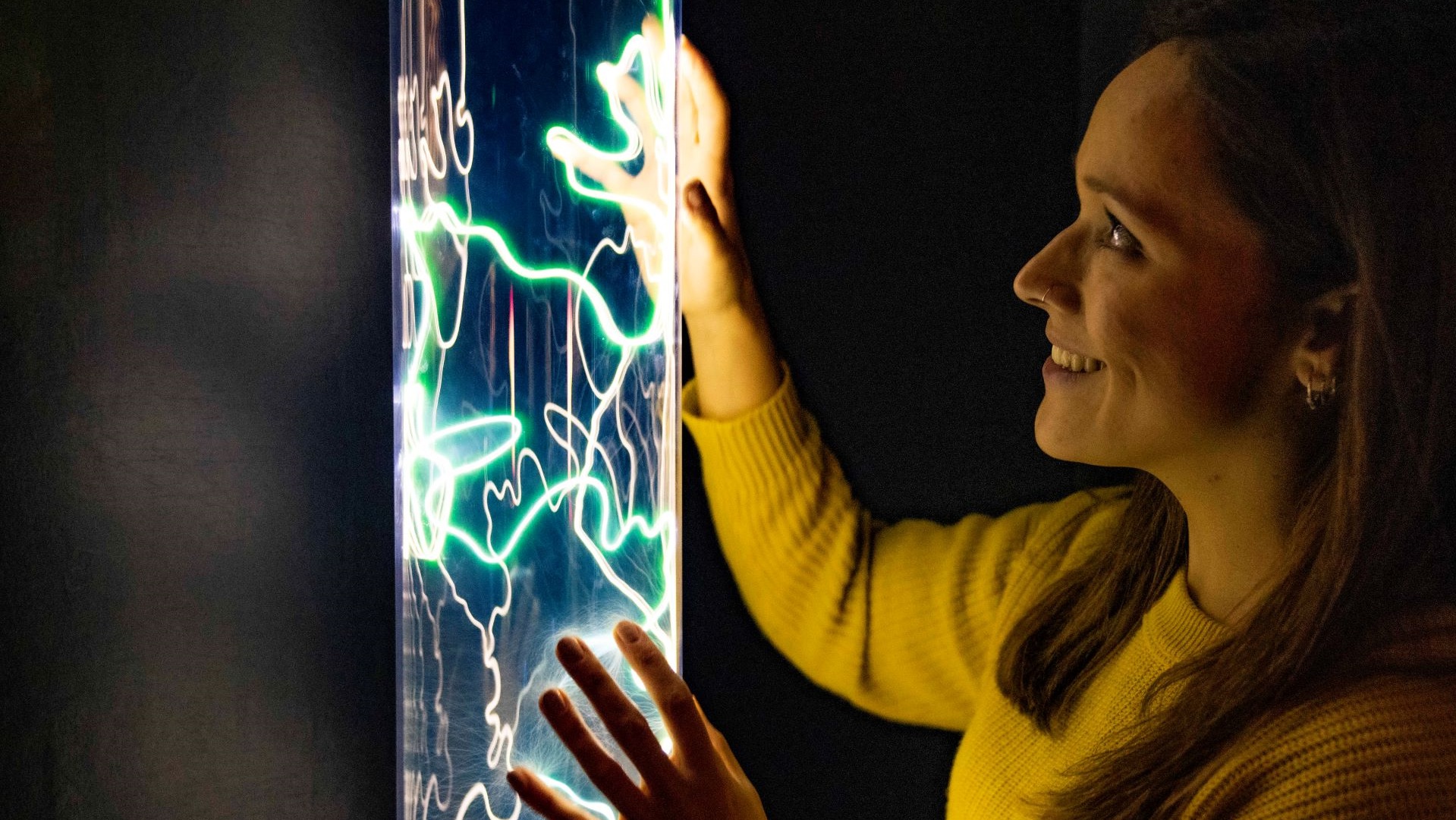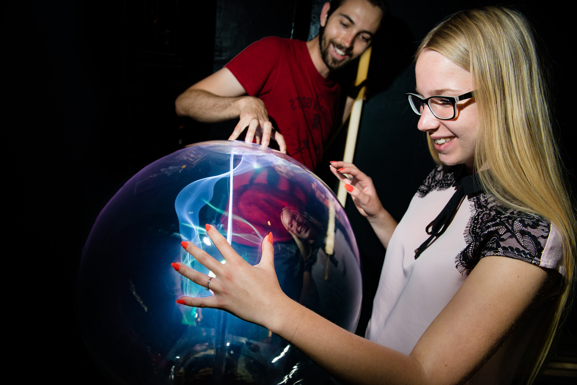 The Magic Gallery Plasma Tubes and Globes bring electricity right to your fingertips. You can literally light up the room by using your hands to connect our giant Plasma Ball to a light tube on the wall. Don't worry if you feel the spark as a tiny shock - it's a very small current, which is quite safe.